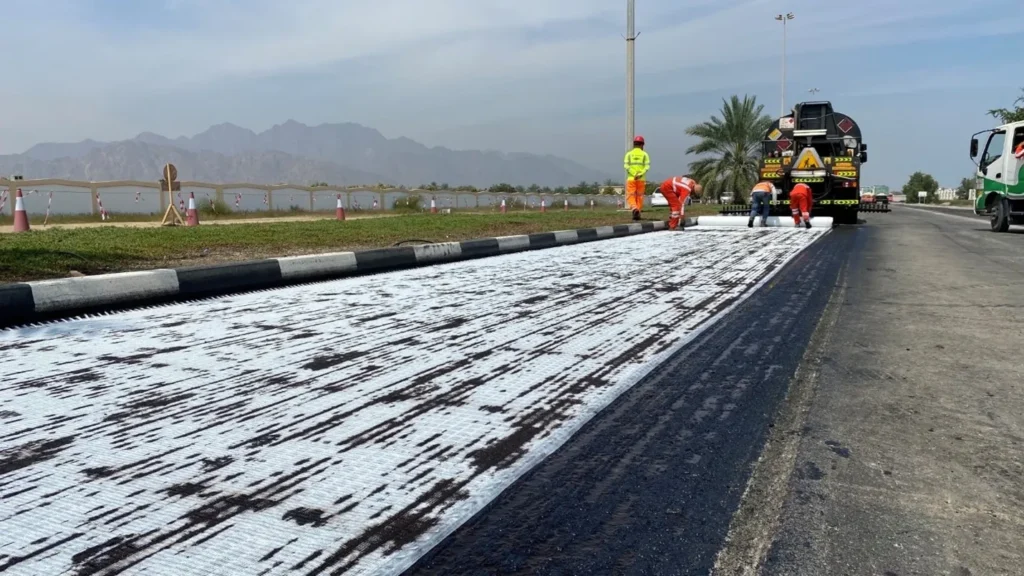 Installs high-performance asphalt reinforcement interlayers across transition interfaces.